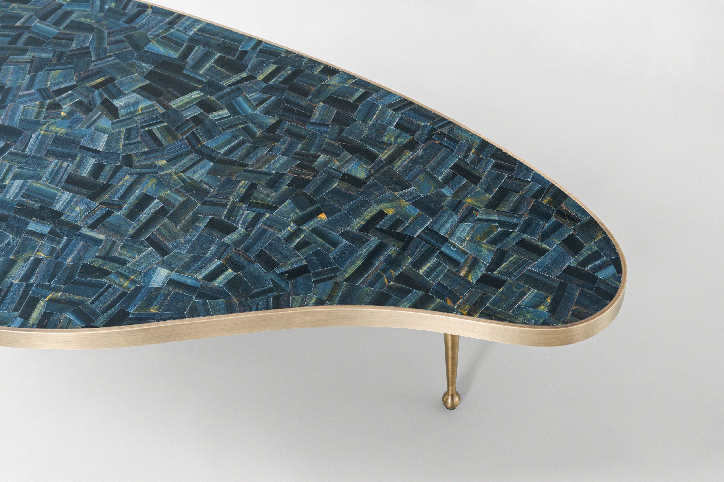 A streamlined band of satin brass or bronze wraps the teardrop shape of the Lola Coffee Table, delicately framing the graphic formations and tonal patterns of its semi-precious stone top. A trio of tapered pin legs with spherical feet, all hand-cast in matching metal, adds subtly to the sculptural effect.